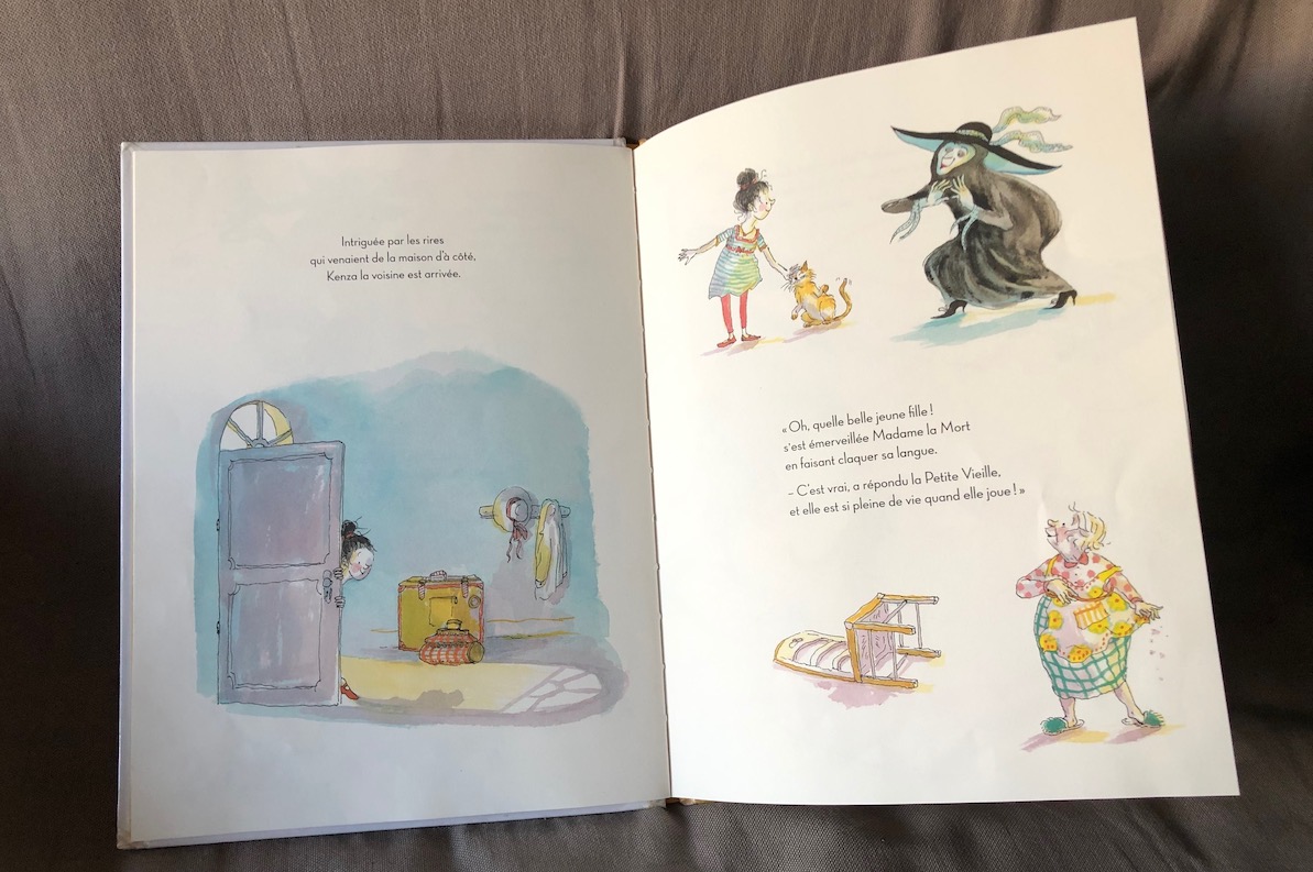 Dans sa petite maison, la Petite Vieille s’ennuyait, elle ne voyait plus personne, ne riait plus, ne jouait plus… elle avait alors décidé d’attendre Madame la Mort. Quand cette dernière pointa son nez, à bord de sa belle auto, la Petite Vieille l’invita d’abord à boire un bon thé, puis se dit que ce serait encore meilleur avec des sablés, alors elle partit cuisiner. “Cinq minutes de plus ou cinq minutes de moins, quelle importance ? “