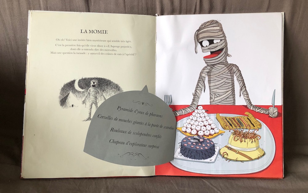 En soulevant les cloches de chaque affreux, on découvre des mets particulièrement alléchants pour eux ! Croquettes de grand-mère, Pomme à l’arsenic, gaspacho de sang frais, gâteau hanté, soupe au tétanos, crottes de chat au chocolat… Tous ces plats vont faire le régal des convives qui s’impatientent. En effet, il manque encore un invité surprise, et en sentant son plateau les affreux ont mal au coeur. Mais qu’est-ce qui se cache là-dessous et qui est capable de manger ça ?